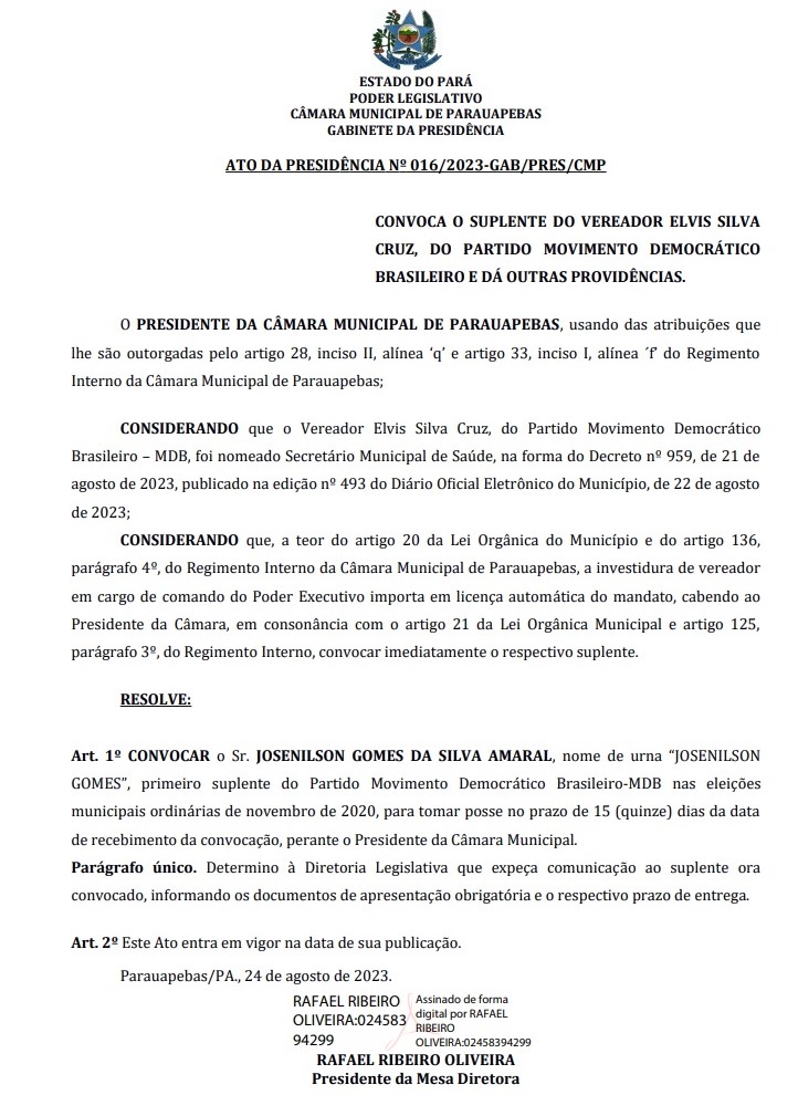 Como o então vereador Elvis Silva (MDB), conhecido como “Zé do Bode”, foi convidado pelo prefeito Darci Lermen (MDB) para assumir a Secretaria Municipal de Saúde de Parauapebas (Semsa), o cargo ficou vago na Câmara Municipal de Parauapebas (CMP), e com isso, o presidente da Casa de Leis, vereador Rafael Ribeiro (MDB), convocou o primeiro suplente para assumir a vaga. Trata-se de Josenilson Gomes da Silva Amaral (MDB), que terá o prazo de até quinze dias para tomar posse.