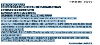 Foi publicado na edição desta segunda-feira (21) do Diário Oficial de Parauapebas o extrato de contrato número 20240841, em que a Secretaria Municipal de Assistência Social de Parauapebas (Semas), contrata a empresa Academia Black Fitness Eireli com o objetivo da compra de material de consumo.