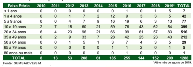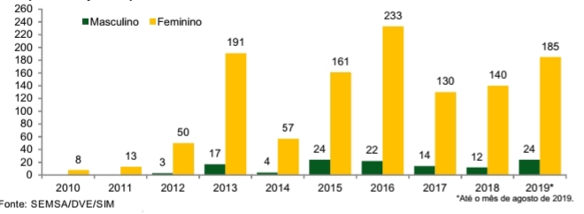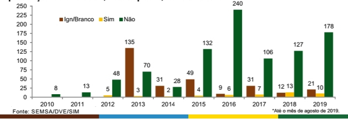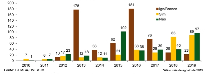 Um dado nada positivo, apresentado no boletim, é a repetição da violência; já que aproximadamente 25% (314/1288) do total de violências ocorridas nos anos de 2010 a agosto de 2019, já ocorreram outras vezes. Assim como em outros campos da notificação, essa informação aparece como ‘ignorada/branco’ em 46,58% (600/1288) dos casos. Porém, observa-se que ao longo dos anos esta informação está sendo melhorada, representando em 2018 apenas 19,08% (29/152) dos casos de violência.