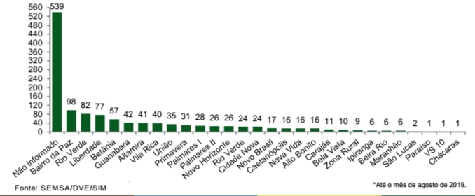 Quanto ao bairro de residência das vítimas de violência durante os anos avaliados, a maioria (41,85%) não há informação, dificultando o mapeamento da violência no município. Dos casos que foram informados, 7,6% (98/1288) das vítimas residem no Bairro da Paz, 6,37% (82/1288) no Rio verde e 5,98% (77/1288) no Bairro Liberdade.