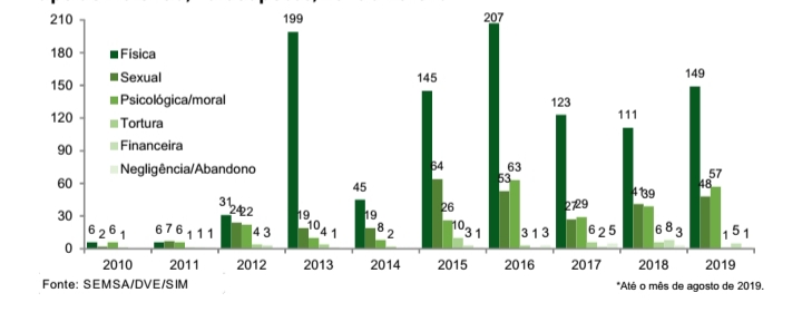 Assim, o boletim detalha os diversos tipos de violência: física, sexual, psicológica, tortura, financeira, além de negligência ou abandono; detalhadas por raça/cor, gênero, faixa etária, escolaridade, estado civil, ocupação, local de ocorrência, bairro de residência das vítimas, repetição de violência, por presença de eficiência na vítima, e por ciclo de vida.