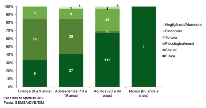 De acordo com o boletim, nos adolescentes entre 10 e 19 anos, a violência mais frequente também foi a sexual (43,44%), seguida da física (36,36%), da psicológica/moral (12,12%), financeira (1,51%) e negligência/abandono (1,51%). Na população adulta (20 a 64 anos), violência física foi responsável por 67,07% das notificações, e em seguida, a violência psicológica/moral com 26,95%. Referente à população com 65 ou mais anos de idade, foi observada a notificação de apenas um caso até o momento, sendo um caso de violência física.