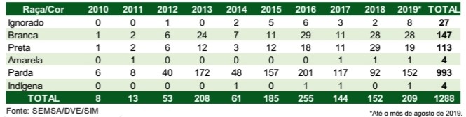 No que se refere à raça/cor, a parda foi a mais informada nas notificações, representando 77,1% (993/1288) do total, seguida da branca com 11,41% (147/1288) e da raça/cor preta com 8,77% (113/1288). Amarelos e indígenas corresponderam às menores proporções no total de vítimas, representando 0,31% (4/1288) cada. Além disso observou-se que em 2,1% (27/1288) das notificações não havia informação de raça/cor.