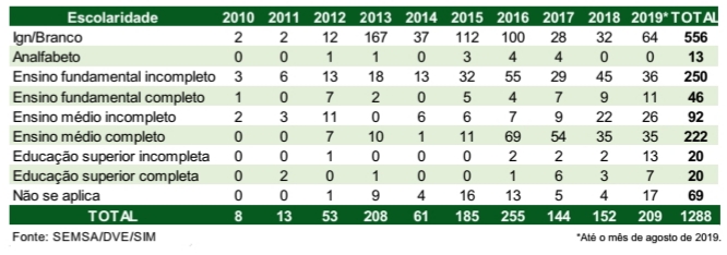 Com relação à escolaridade das vítimas, 43,17% (556/1288) não se pode afirmar o grau de instrução, devido ao número de notificações não preenchidas ou então preenchidas com o campo ‘ignorado’. Apesar desta dificuldade, a escolaridade das vítimas que apresenta maior número é de ensino fundamental incompleto, com 250 casos notificados ao longo da série histórica.