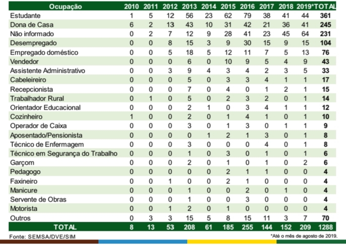 A ocupação das vítimas em sua maioria (27,03%) são de estudantes, o que vai de encontro faixa etária composta por jovens adolescentes que estão em condições peculiares de desenvolvimento. Quanto ao estado civil das vítimas, os solteiros e casados representaram a maioria, com 54,58% (703/1288) e 25,93% (334/1288) dos casos, respectivamente.