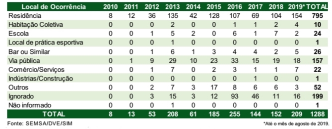 A residência foi o local de maior ocorrência das violências (61,72%), seguida da via pública (12,19%) e outros (4,04%) – os quais se referem a instituições sócio educativas, estabelecimentos de saúde e ambientes de trabalho. Em 15,53% (200/1988) das notificações não havia informação do local de ocorrência.