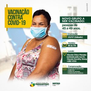 pandemia COVID-19: Vacinação de pessoas com idade de 49 a 45 anos será neste sábado em Parauapebas Publicado em 02/07/2021