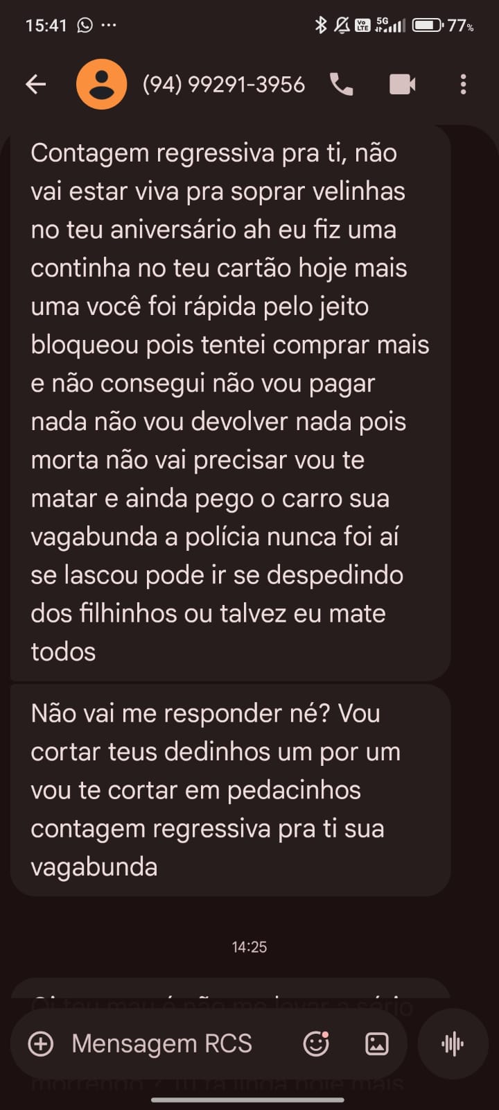 • Ameaça aos filhos: O terror se estendeu à família; em uma das mensagens, ele disse: “pode ir se despedindo dos filhinhos ou talvez eu mate todos”. A vítima tem três filhos, de 21, 18 e 10 anos.