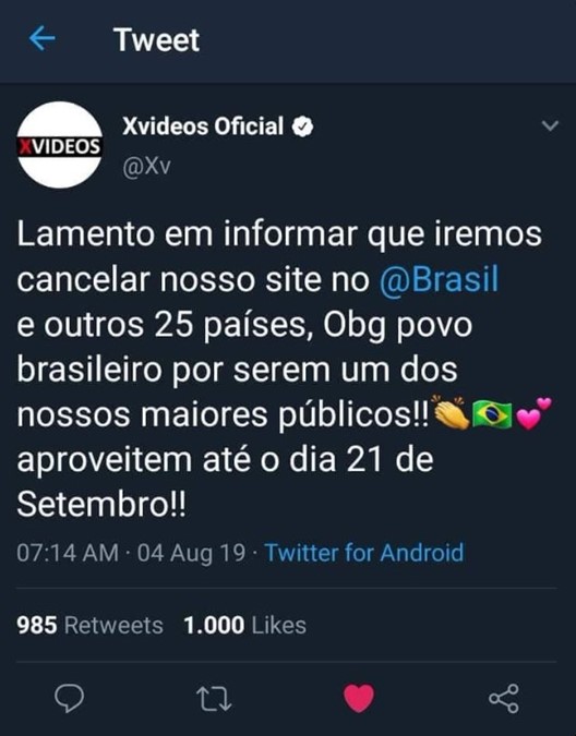 Uma polêmica tem circulado pela internet desde a semana passada. Um suposto tweet do site XVideos, especializado em streaming de conteúdo adulto, informou que a plataforma encerraria as suas atividades no Brasil e em mais 25 países. O público brasileiro do site — que não é pouco — ficou agitado com o boato. Será que a informação procede?
